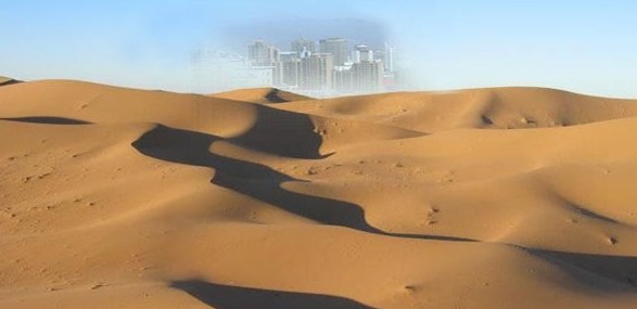 在荒无人烟的沙漠中行走,有时会突然在前方出现一个湖水面碧蓝、波光闪闪的湖,岸边有树有草,有人还有城楼。可是走近了,却又什么都没有了。这是怎么回事呢?原来,沙漠的温度特别高,而空气的传热性能有很差。没有风时,上下的气温相差很大。当太阳从高空的气层进入下面时,光的速度发生了变化。射来的光通过折射和反射将远处的山、水、人的景象映射到人们的面前,使沙漠中的人产生了幻觉,海市蜃楼便出现了。