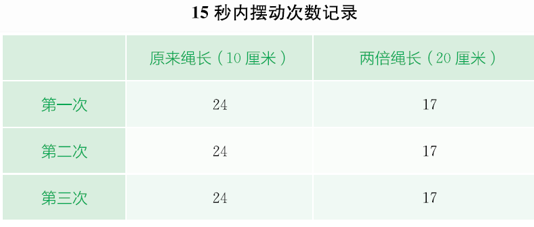 P61不改变摆锤的重量,把绳子增加到原来的两倍,同样观察摆在15秒内摆动的次数。看看加长绳子会不会影响它摆动的快慢?