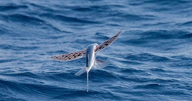 飞鱼长有一对发达的胸鳍,尾鳍也较发达,这种鳍使飞鱼具备了飞行的条件。当由胸鳍产生的上升力和尾鳍的前进力合在一起时,飞鱼就能离开水面飞行了。