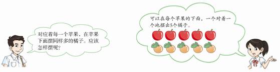 用“一一对应”的方法摆出和苹果同样多的橘子,然后后面再摆2个橘子。