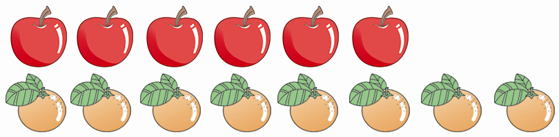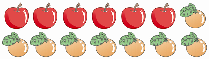 现在橘子比苹果多2个,怎样才能使上下两行水果的个数同样多呢? |