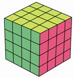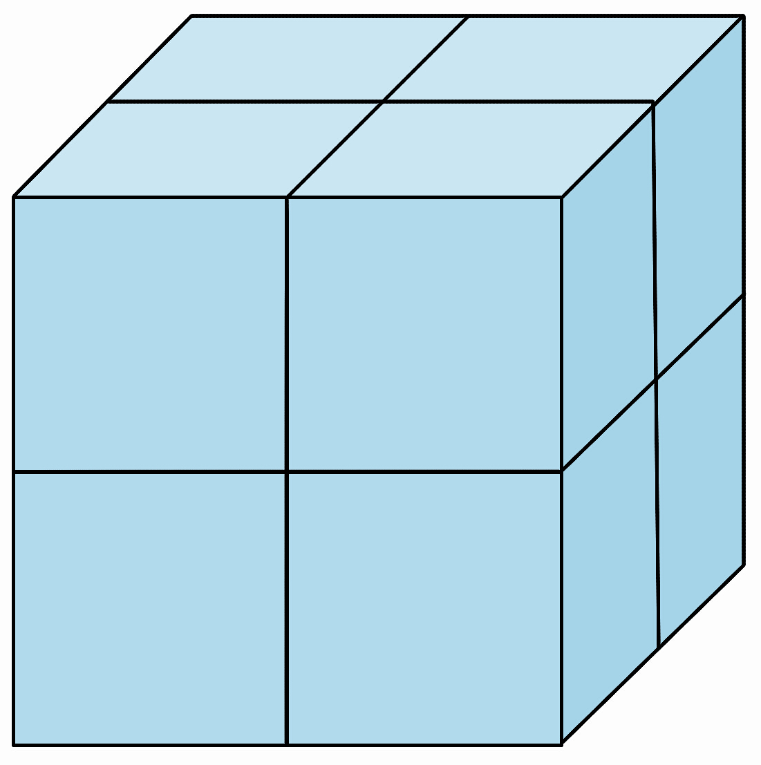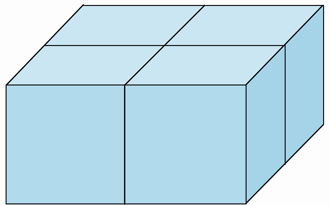 每行最少是2块,2+2=4(块),4+4=8(块),也就是说用小正方体摆一个大正方体最少需要8块。 |