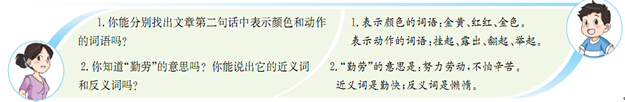 1.除了找出文章第二句话中表示颜色的词语,家长还可以鼓励孩子说说其他表示颜色的词语。如两字词语:粉红、洁白、乌黑、湛蓝;三字词语:红艳艳、黄澄澄、绿油油、黑乎乎等。