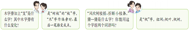 家长和孩子比赛,一起给生字“枝”换偏旁,并给新字组词。