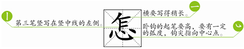 家长让孩子先说一说“怎”的结构,然后让孩子仔细观察字形,说说怎么才能写好心字底,让孩子在田字格里写一写。