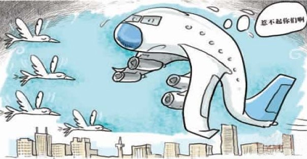 鸟儿的质量和体积虽然很小,在空中飞行的速度也不是很快,但是当它与高速飞行的飞机迎头相撞时,它们加在一起的速度就非常大了。科学家们计算过,一只7.2千克的飞鸟和一架960千米时速的飞行器相撞,飞鸟对飞机的撞击力将达127万牛顿,这绝不亚于一颗重型炮弹对飞机的威胁。
