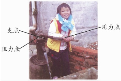 压水井是一种将地下水引到地面上的一种工具,压水井的压杆在工作时就相当于杠杆,如图所示,固定压杆的转轴是支点,小朋友用力下压的一端是用力点,压杆翘起的一端是阻力点。