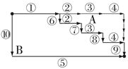分析:如下图所示,①②③④这4条线段与⑤平行,且这4条线段的长度和等于⑤的长度;同理可得⑥⑦⑧⑨4条线段的长度和等于⑩的长度。即这两条路都是长方形的一条长与一条宽的和,所以这两条路距离相等。