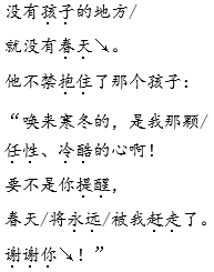 解析 本篇课文朗读的语气、语调、情感的变化幅度较大。朗读时,要注意巨人回来前后及巨人醒悟前后的语气、语调的变化,并想象花园情景的变化。巨人醒悟前,花园里寒冷的冬天要读得凄凉,语调要低缓;巨人醒悟后,语气要活泼,充满生气,语调要上扬。巨人醒悟前的语言要读得粗野自私,醒悟后的语言“噢!是这么回事呀”“谢谢你”等,要读出巨人悔恨的心情。
