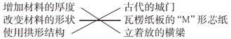 解析:大多数的古代城门都会利用拱形结构来增强其牢固程度;房屋的横梁要立着放是因为这样可以增加材料的厚度从而增强横梁的抗弯曲能力;瓦楞纸板的芯纸是通过改变形状来增强抗弯曲能力的。