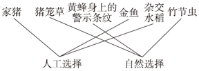 (2)野鸭经过人类的圈养变成家鸭;鲫鱼经过人类的培育和选择变成具有欣赏价值的金鱼;稗子与水稻经过人工杂交,培育出杂交水稻。