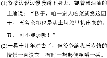 答案 (1)通过“扒”这个动词,可以看出爷爷的目的是告诉孩子土地是农家生活的命根子,到任何时候都不能忘本。农民不能不劳而获,要依靠土地和辛勤劳动获得收获。