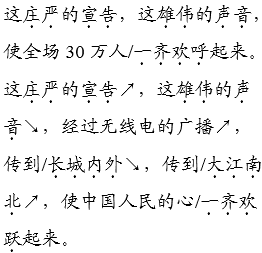解析 朗读本文的总体基调是兴奋、激动、自豪的。但各个部分侧重点不同,语调也略有变化。如第1自然段适宜用庄严而平直的语调来读;第10自然段适宜用高昂兴奋的语调来读。另外,要抓住重点词语和重点句子,把文章的感情色彩读出来。