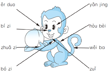 解析 这个练习是关于读拼音、识词语、认事物的训练。在朗读时要读准声母、韵母和声调,如,ěr duo、bí zi、zhuǎ zi、bó zi、yǎn jinɡ、wěi ba这几个词的尾音读轻声;zuǐ是平舌音。