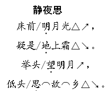 《静夜思》语言凝练,感情真挚,意境深远,反映出了游子的静夜思乡之情。如霜的月光就好似一只看不见的手,无声地拨动着诗人的心弦;举头仰望,低头沉思,俯仰之间,神驰万里,表现了诗人对故乡无尽的思念。朗读时,语速稍慢,语调低沉,一边读一边想象古诗描写的情景,一、三句声音较实,二、四句声音较虚。“前”“是”和两个“头”字适当拉长,稍作停顿;“光、霜、乡”这三个韵脚要读实。然后在熟读的基础上理解诗意,并根据诗意背诵诗歌。