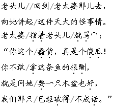 解析 本文是一首童话叙事诗,讲述了一位老渔夫的妻子贪得无厌、永不满足,对知恩图报的金鱼提出越来越高的要求,最后一无所得的故事。分角色朗读课文时,注意把握不同人物的性格特征,用不同的语气,把诗中每个人物的特点读出来。如:金鱼的善良,老渔夫的软弱,渔夫妻子的凶狠、贪婪等。叙事部分的朗读语气要随着环境描写的变化而变化。也可在分角色朗读的基础上,加上人物的表情和动作,增添些小道具和服装,以课本剧的形式演出。