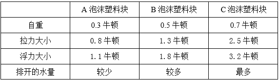 (6)体积不同的泡沫塑料块完全浸入水中,受到的浮力大小主要与它排开的水量有关。