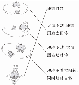 (1)地球不动,太阳围着地球转;太阳不动,地球围着太阳转;地球自转;地球围着太阳转,同时自转。