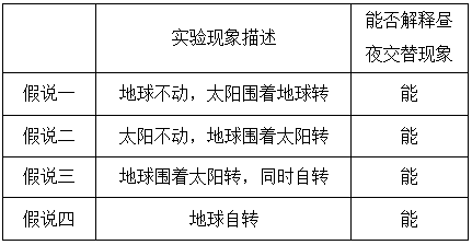 解析:通过以上几个模拟实验,我们发现在标记处都有明暗交替变化。这种明暗交替变化就是地球上的昼夜交替现象。这些假说都能解释地球上的昼夜交替现象。