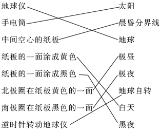 解析:本题是模拟极昼、极夜的成因,地球在自转的同时围着太阳公转,而且自转轴的方向是倾斜的,在公转过程中自转轴的方向不变。当阳光直射在北半球时,我们就会发现北极地区始终会被太阳照亮。同理,阳光直射在南半球时,南极此时就处在极昼的时候。