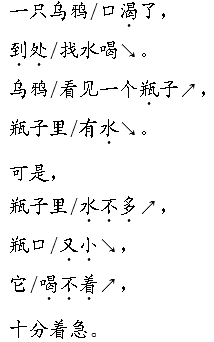 解析 这篇课文讲的是一只聪明又爱动脑的乌鸦的故事。因此,在朗读时既要读出乌鸦的聪明,又要读出乌鸦的乐于思考。读第1自然段开头时语速稍慢,读出乌鸦“到处找水喝”的那种着急而又找得很辛苦的语气。第2自然段要读出发现瓶子时的喜悦和喝不着水时的无奈之情。第3自然段的问句要读得慢些,说明乌鸦在努力寻找解决问题的办法。