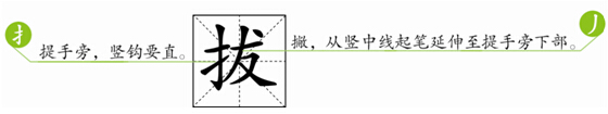 家长让孩子观察“拔”字的间架结构,说出各重点笔画,及在田字格中的位置。