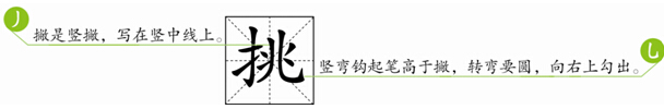 “挑”在书写时注意左窄右宽,右面是“兆”,不是“北”。左边的提手旁要写得窄,右边的“兆”要写得宽。“兆”竖撇的起笔在竖中线上,点、提相对,竖弯钩的起笔要高于撇的起笔,撇、点相对,整个字要写得匀称。