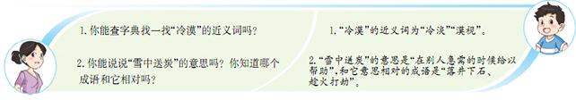 2.先让孩子结合字面意思理解“雪中送炭”的含义,家长再给孩子讲讲成语“落井下石”“趁火打劫”的意思。