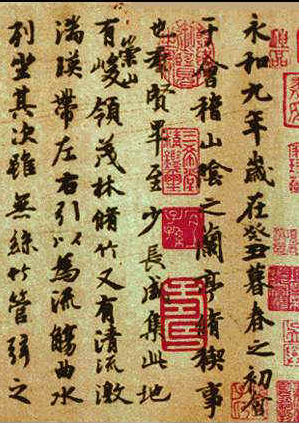 晋穆帝永和九年(353)三月初三日,王羲之与名士孙统、孙绰、谢安、支遁等四十一人在会稽的兰亭修禊,曲水流觞,赋诗抒怀。其间作诗三十七首,结纂为《兰亭集》,由王羲之为此作序,这就是“天下第一行书”《兰亭集序》,也称《兰亭序》、《兰亭》。
