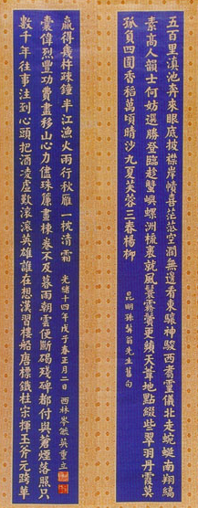 此长联由昆明名士陆树堂用竹书刊刻,公元1857年与楼同毁于兵燹,公元1866年,马如龙重修大观楼,公元1888年,云贵总督岑毓英使赵藩将长联重新楷书刊刻于楼前,为今所见者。1983年1月,大观楼被云南省人民政府公布省级重点文物保护单位。