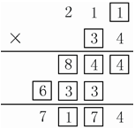 分析:根据积的个位上是4,第二个乘数个位上也是4,可以判断出第一个乘数个位上可能是1或6。根据积的最高位上是7,第一个乘数最高位上是2,2×3<7,可以判断出第二个乘数最高位上只能是3,这时可以采用假设法进行尝试: