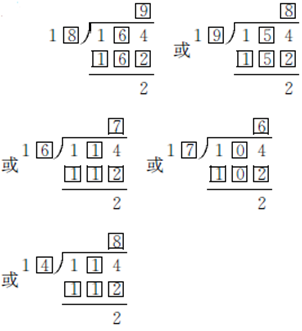 分析:根据题意可知,除数是两位数,被除数是三位数,而商是一位数,这说明被除数的前两位除以除数不够除,根据1□4÷1□=□……2可知,商与除数个位上的数相乘所得的积的个位上是2。因为1×2、2×6、3×4、4×8、6×7、8×9的积的个位上都是2,所以商×1□可能是1×12、2×11、2×16、6×12、3×14、4×13、4×18、8×14、6×17、7×16、8×19、9×18。因为1□×商的积是三位数,所以符合题意的只有8×14、6×17、7×16、8×19、9×18。把商和除数分别代入除法竖式中,通过计算可完成竖式。