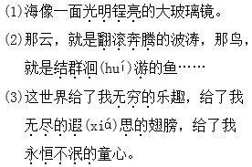 (3)“无穷的”是没有穷尽;没有限度。“无尽的遐思的”是没有穷尽,没有限度的想象。“永恒不泯的”是永远不会消失的。这几个词语把大海给作者带来的快乐表达得淋漓尽致。