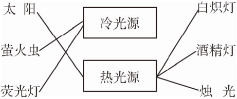 解析:热光源是指光源在发光的同时也发热,比如太阳、白炽灯(通过高温发光)、酒精灯(火焰有热量)、烛光(火焰也有热量)。冷光源是指光源在发光的同时只发光,不发热。萤火虫是体内的发光物质通过化学反应发出的光,热量非常微小,属于冷光源;荧光灯是靠管内气体击穿后电离放电产生紫外线而激发管壁上的荧光粉而发光的,其光线不具有热量,也属于冷光源。
