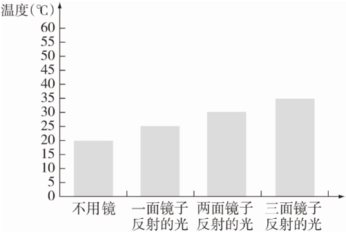 综合解析:通过表格中的数据可知,本组实验是研究“反射光的强弱与温度的关系”,用3面镜子反射阳光时光线最强。画图时要注意每个小格对应的数值,特别是不用镜子时的温度应该是常温。通过实验我们可以得出结论:多面镜子反射光线最强,热量最多。对于同一种热光源,光的强度越高,光的温度越低。