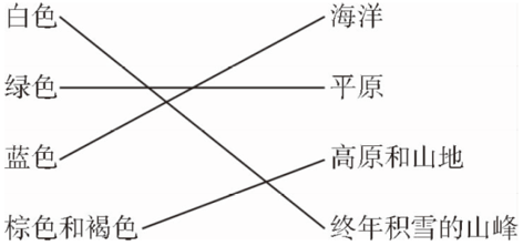 解析:本题考查的是看简单的地形图。深浅不同的棕色和褐色分别表示海拔2000米~5000米以上的高原和山地;白色表示终年积雪的山峰,往往都在6000米以上;深浅不同的蓝色表示各种深度的海洋;绿色代表平原。