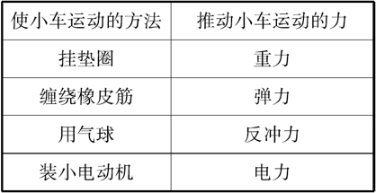 解析:垫圈在重力的作用下拉动小车运动,缠绕的橡皮筋在弹力作用下推动小车运动,气球小车依靠气球喷出气体的反冲力来推动小车运动。