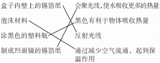 解析:颜色物体反射光的能力强,所以盒子内壁使用锡箔纸是为了反射光线加热;泡沫材料能减少空气的流通,起到保温的作用;深色物体吸收热的能力强,所以涂黑色的塑料瓶是因为黑色有利于物体吸收热量,凹面镜有汇聚光线产生高温高热的作用,所以凹面镜的锡箔纸是为了会聚光线加热。