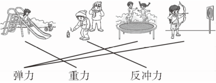 解析:滑梯上的人往下滑是受到了重力的作用;放鞭炮时,烟花上冲到空中是受到了反冲力的作用;在蹦床上运动和用弓箭射中靶子都是应用了弹性物体发生形状改变时产生了弹力的原理。