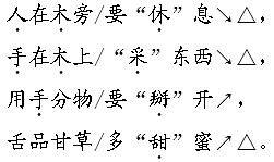 解析 这道题是训练我们自读自悟的能力,同时用本课学过的“合一合”的识字方法学习会意字。这篇韵文共四行,其中“休、采、掰、甜”四个字都是用“合一合”的识字方法构成的会意字。朗读时可以边读边理解韵文的含义,记住这四个会意字。