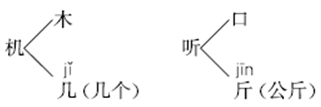 解析 先试着读一读题中的两个生字,再看一看它们分别可以分成哪两个字,注音并组词的生字就是用分一分的方法学到的生字。最后再试着用这种方法多认识几个生字。