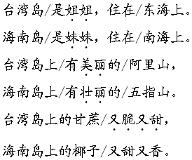 解析 这篇课文用拟人的手法写台湾岛和海南岛都是中国的领土。朗读时,要用喜爱、赞美的语气来读,表达对台湾岛和海南岛的热爱之情。但每个自然段的朗读基调要略有区别,如,第1自然段要抓住“都是”这一词语,用亲切的语气来读;第2自然段要抓住“又脆又甜、又甜又香”这两个词语,用喜悦、赞美的语气来读。