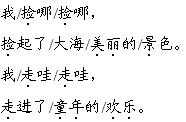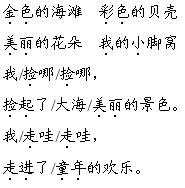 解析 本题第一行出示的词组都由两部分组成,前部分修饰后面部分,“的”字要读轻声。后面两个句子是描写孩子们在海边玩耍的句子。边读边想象孩子们在海滩上玩耍的画面,与他们一起体验童年的乐趣,读出满心的喜悦。