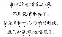 解析 这首诗歌轻柔活泼,充满想象力。朗读时,每小节中的“谁也没有看见过风,不用说我和你了”一句都应该用叙述的语气,把风这一自然现象的特点读出来。“但是”要重读,并适当停顿。余下部分要用亲切、自然的语气,舒缓的语调,读出风的顽皮和发现风时的欣喜。