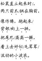 解析 作者笔下的小松鼠是那样的可爱、调皮而又富有灵性,课文字里行间流露着作者对小松鼠的喜爱之情。朗读时,要把自己当成文中的角色认真体会情感,尤其要读好描写小松鼠动作和神情的语句,把握好重音和停顿,边读边想象,读出情趣。在朗读第2自然段时,要把“扭动着身子”“拱在胸前”“背部向上一拱”“尾巴高高一撅”这几个带动作的短语读得重些,突出小松鼠的可爱。