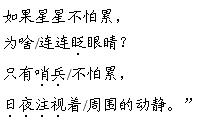 解析 本文是一篇小韵文,读起来朗朗上口。朗读时,前两行要读得轻柔、舒缓一些,以烘托夜晚静谧的环境;奶奶的话要读得慢一些,表现出奶奶的慈祥及对“我”的疼爱;“我”的话要读得欢快、自信一些,表现出“我”对哨兵的崇敬之情。
