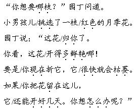 解析 这是一篇非常有教育意义的小文章,文中有小男孩儿、园丁叔叔两个主要人物。朗读小男孩儿的请求时,语气要恳切,要表现出小男孩儿对拥有一枝花的渴望。读第4自然段时,要用欢快的语气,表现出小男孩儿高兴的心情。第3自然段主要是园丁叔叔说的话,要用亲切的语气读,表现出园丁叔叔对孩子的喜爱之情。