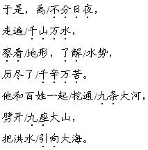 解析 本文是一个古老的传说,朗读时要用叙述的语气,同时要注意断句和重音。如,读第1自然段时,要重读“淹没了”“冲倒了”“失去了”,突出洪水的凶猛无情,表现老百姓生活的艰难;读第4自然段时,要重读“不分日夜”“千山万水”“千辛万苦”“九条大河”“九座大山”,表现出大禹治理洪水的辛苦与执着精神。