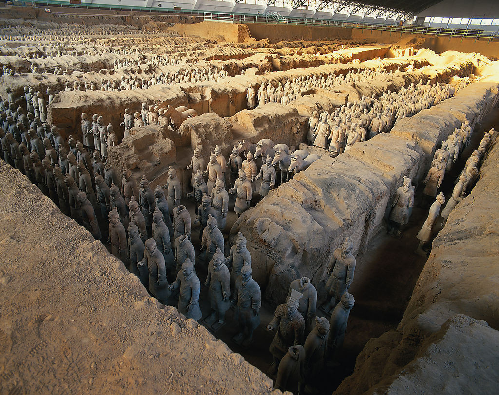 毫无疑问,如果不是1974年被发现,这座考古遗址上的成千件陶俑将依旧沉睡于地下。秦始皇,这个第一个统一中国的皇帝,殁于公元前210年,葬于陵墓中心。在他陵墓的周围环绕着那些著名的陶俑。结构复杂的秦始皇陵是仿照其生前的都城——咸阳的格局而设计建造的。那些略小于人形的陶俑形态各异,连同他们的战马、战车和武器,成为现实主义的完美杰作,同时也保留了极高的历史价值。