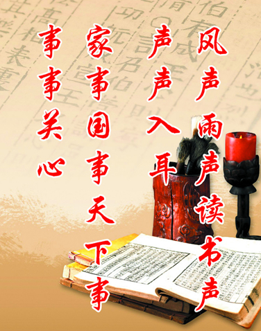 赏析:这是写在无锡东林书院的一副对联,表现的是读书人既认真读书,又关心国家大事的胸怀。此联为明朝东林党领袖顾宪成所撰,上联将读书声和风雨声融为一体,既有诗意,又有深意。下联有齐家治国平天下的雄心壮志。风对雨,家对国,耳对心,极其工整,特别是连用叠字,如闻书声琅琅。